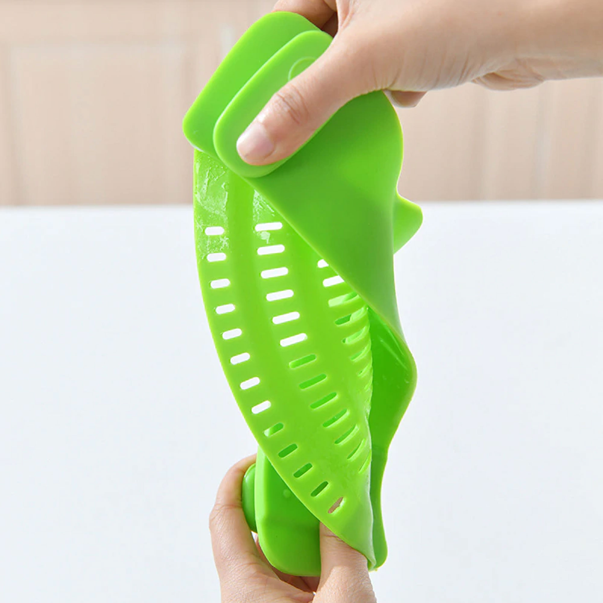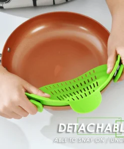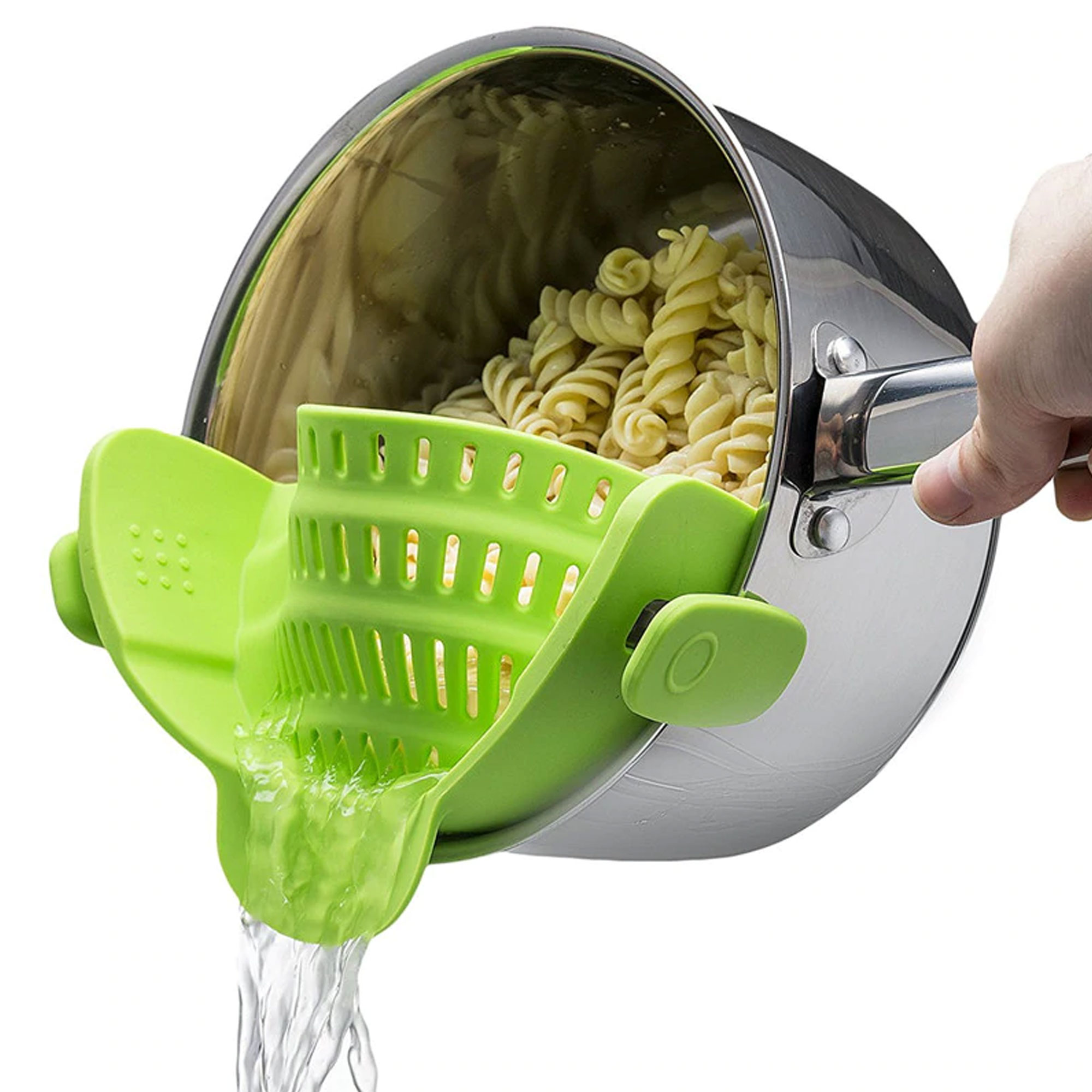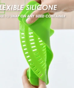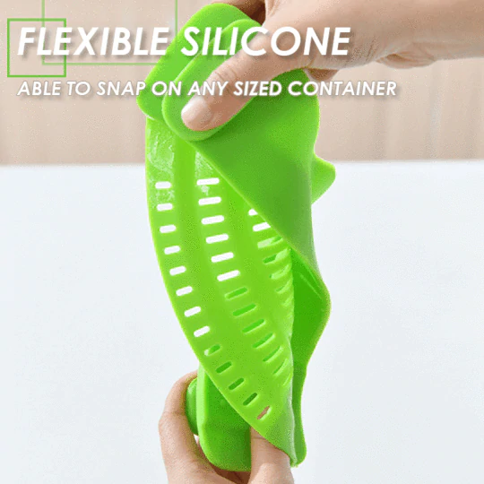 The Snap N’ strain’s universal design will take the strain out of straining. This top quality heat-resistant, silicone colander is the newest, most practical way to get your food strained thoroughly while avoiding transferring the food out of the pot. The Snap N’ Strain is flexible enough to fit into nearly all pots, pans, and bowls. It snaps on neatly with two clips. The clips’ strong grip will keep it safely attached while in use and can be left attached to the pot while cooking. Once snapped the pot can be tilted over a sink or bowl and the Snap N’ Strain will do its magic. The liquids will be poured out while the food remains in the pot, even with heavier foods like potatoes.